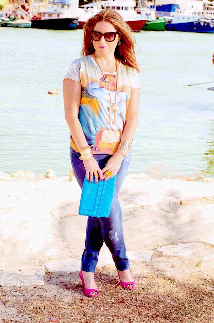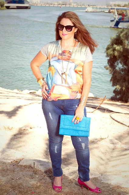 למה ספורטיבי? כי אני לובשת ג'ינס וטי שרט הכי ספורטיבי שיש אבל אני הרי לא יכולה להיות כזו ספורטיבית ולכן לשדרוג נעלי סטילטו בצבע דומיננטי ואקססוריז מוזהבים שישדרגו את הלוק.