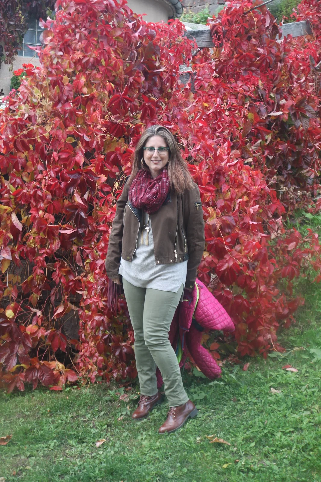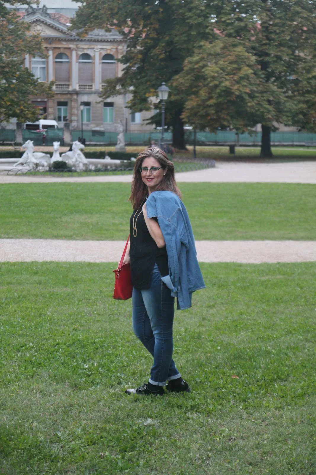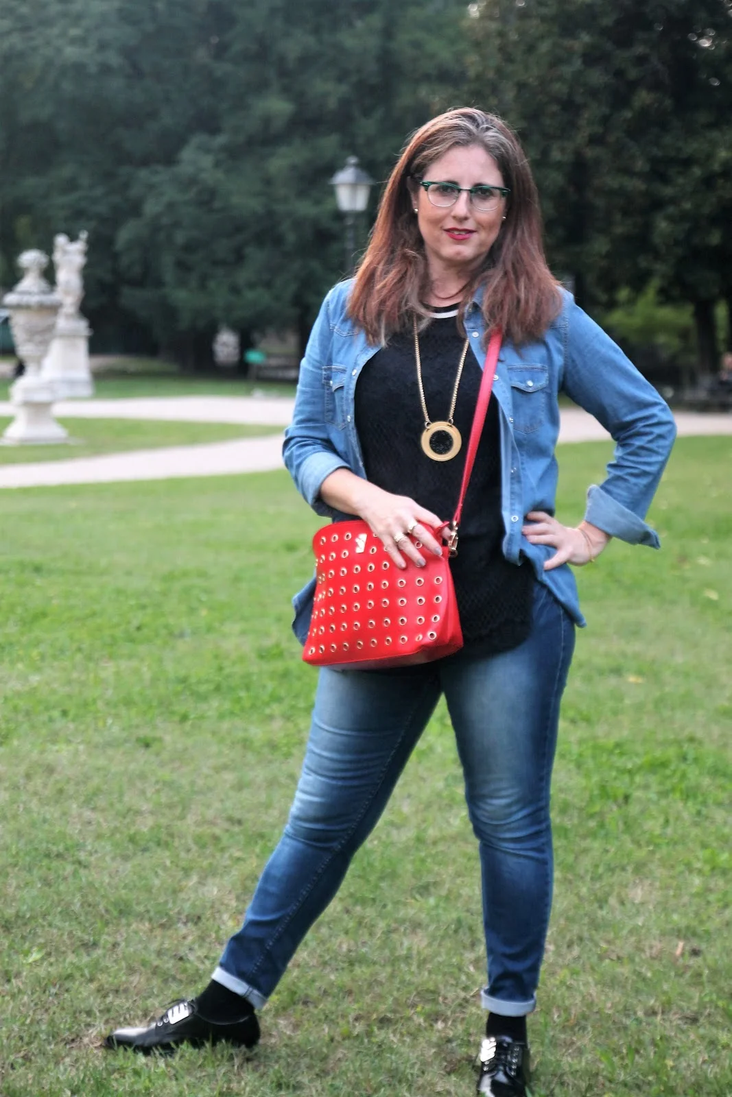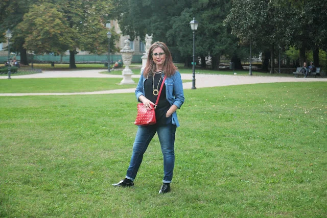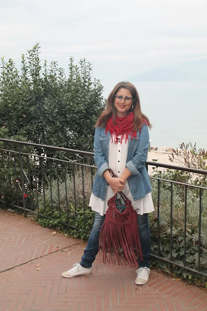 היום אני בג'ינס סקיני, גופיית טוניקה לבנה וחולצת ג'ינס פתוחה שמוסיפה שיק ואת הצבע הוספתי בצעיף ותיק בצבע הבורדו שכמובן מקפיץ את ההופעה.