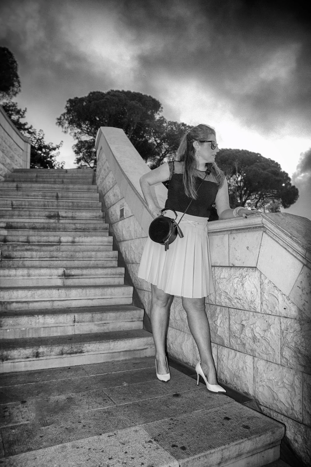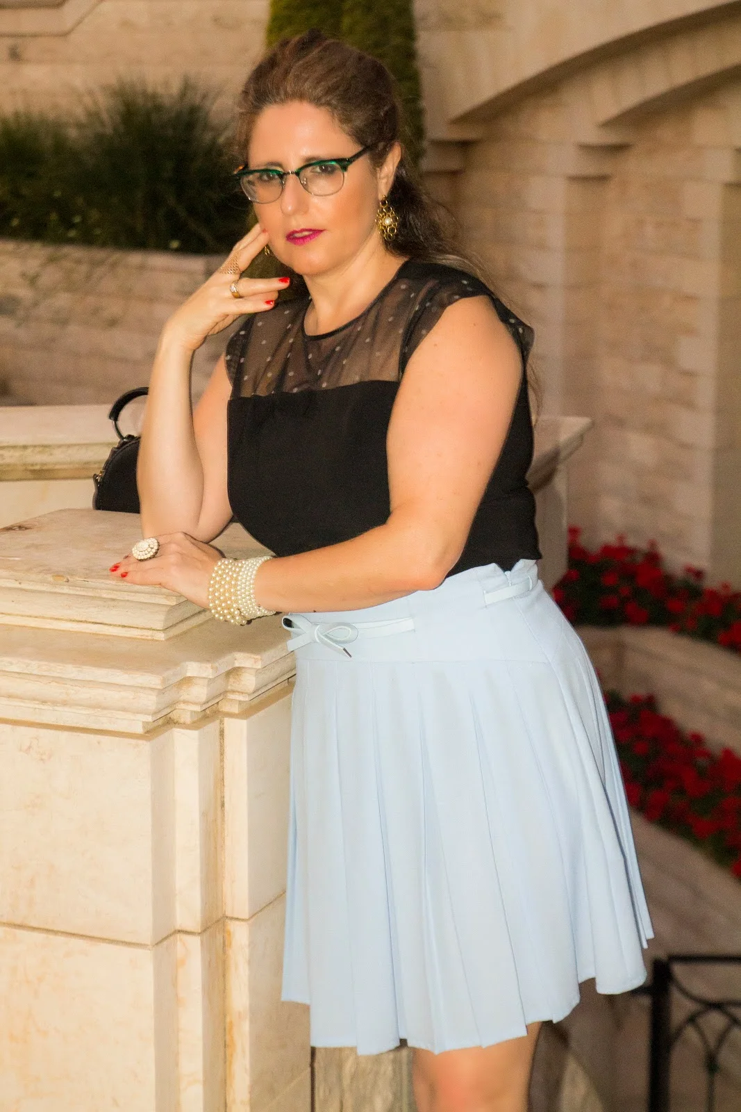 האאוטפיט הראשון -חצאית סאמר חצאית פליסה יפיפיה בצבע תכלת מושלם עם חגורת פפיון וחולצה שחורה עם רשת תחרה וגם לה פפיון .