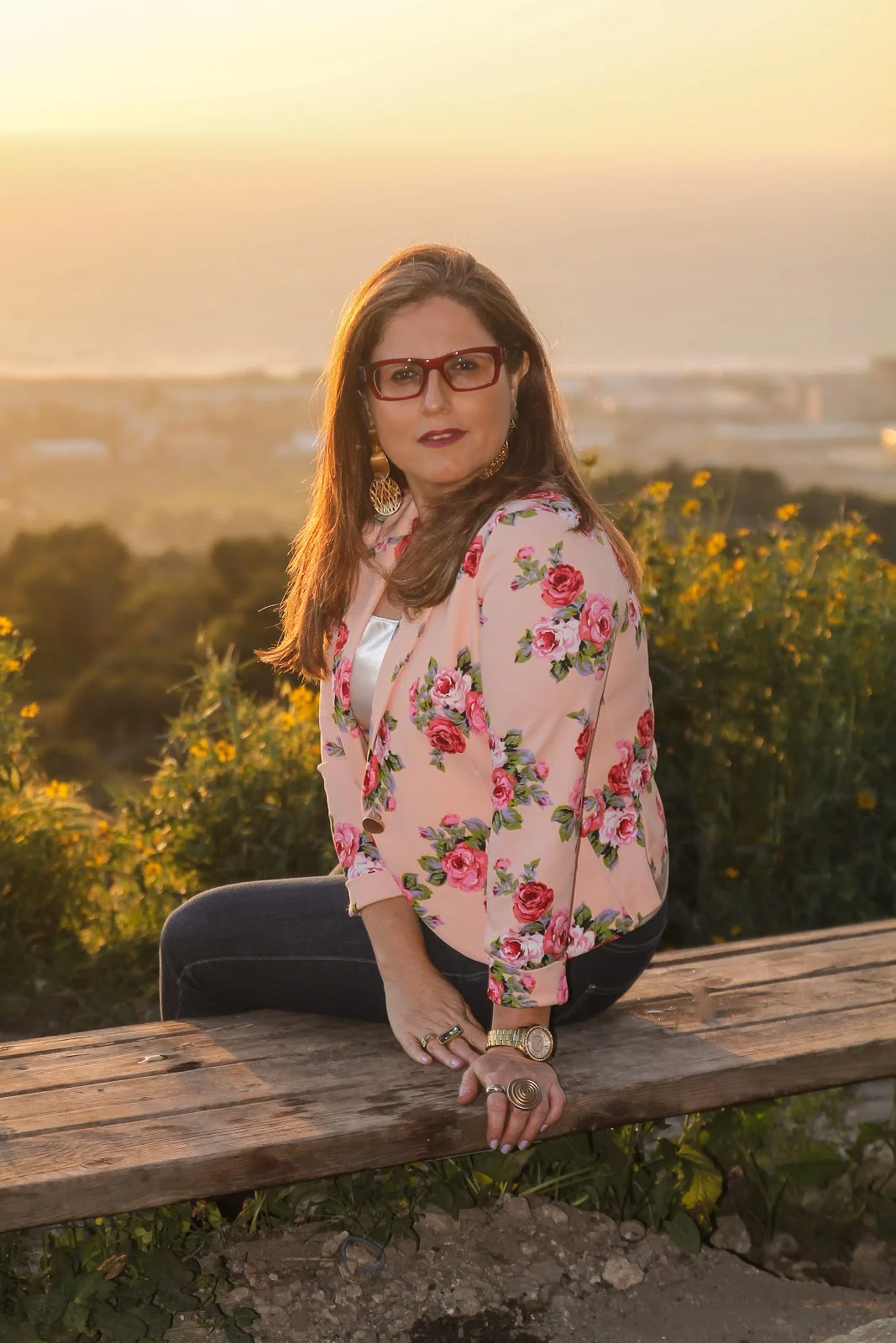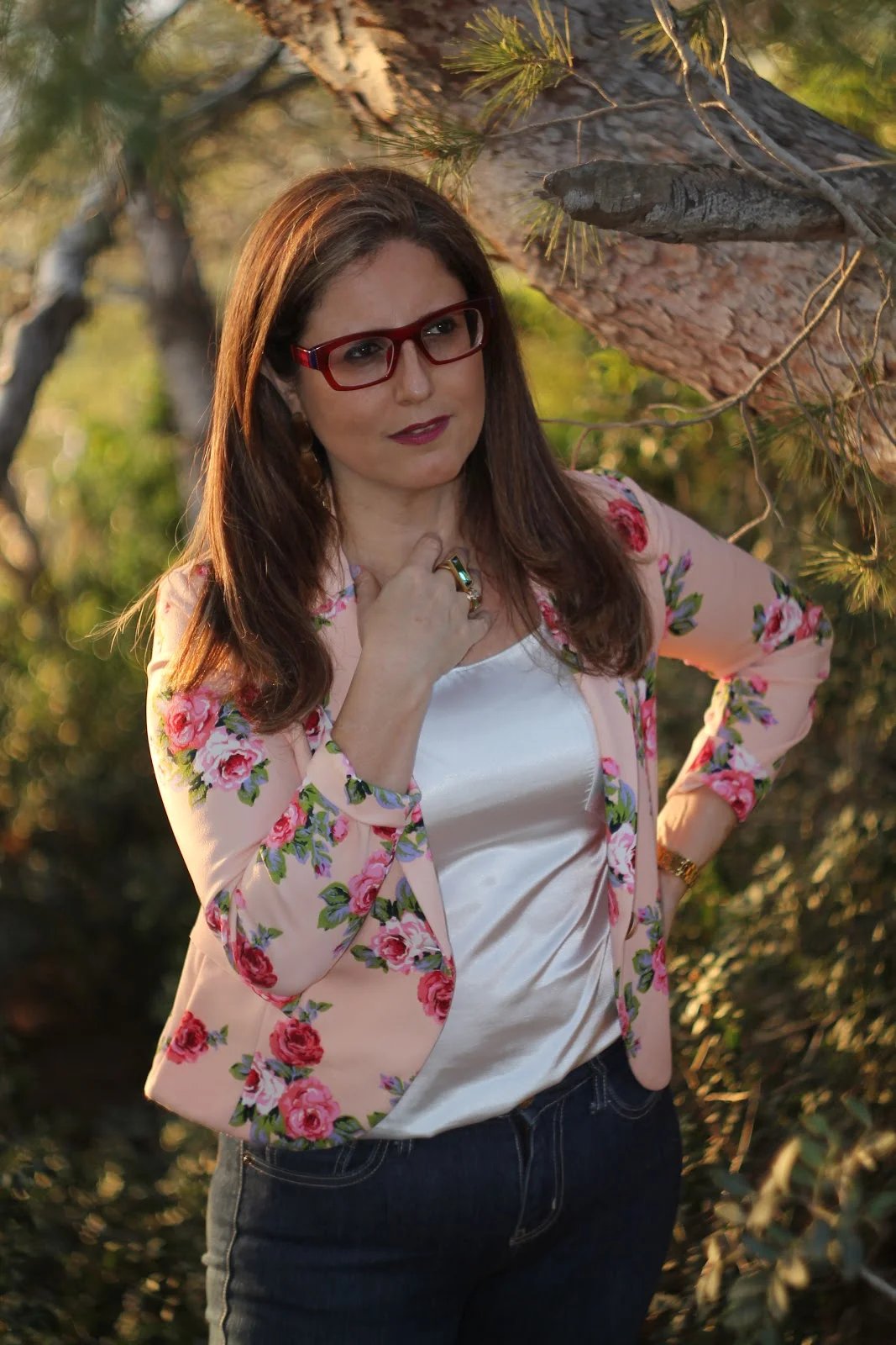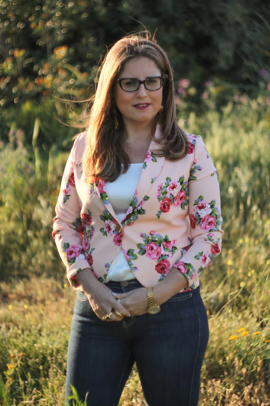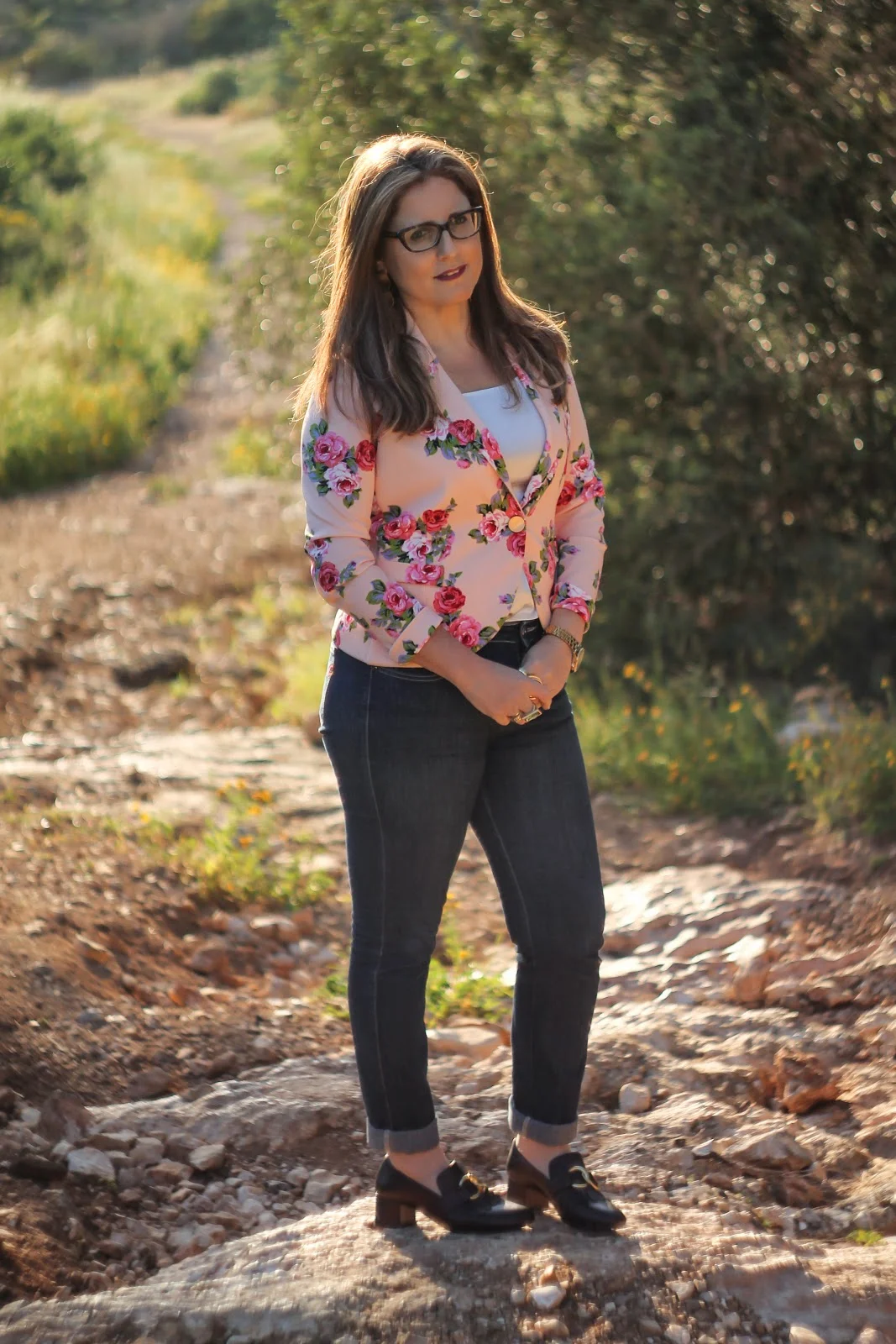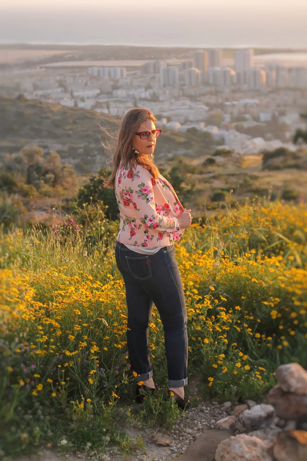ולוק השני עם גופיה לבנה וז'קט פרחוני – הרבה צבע ושמחה.