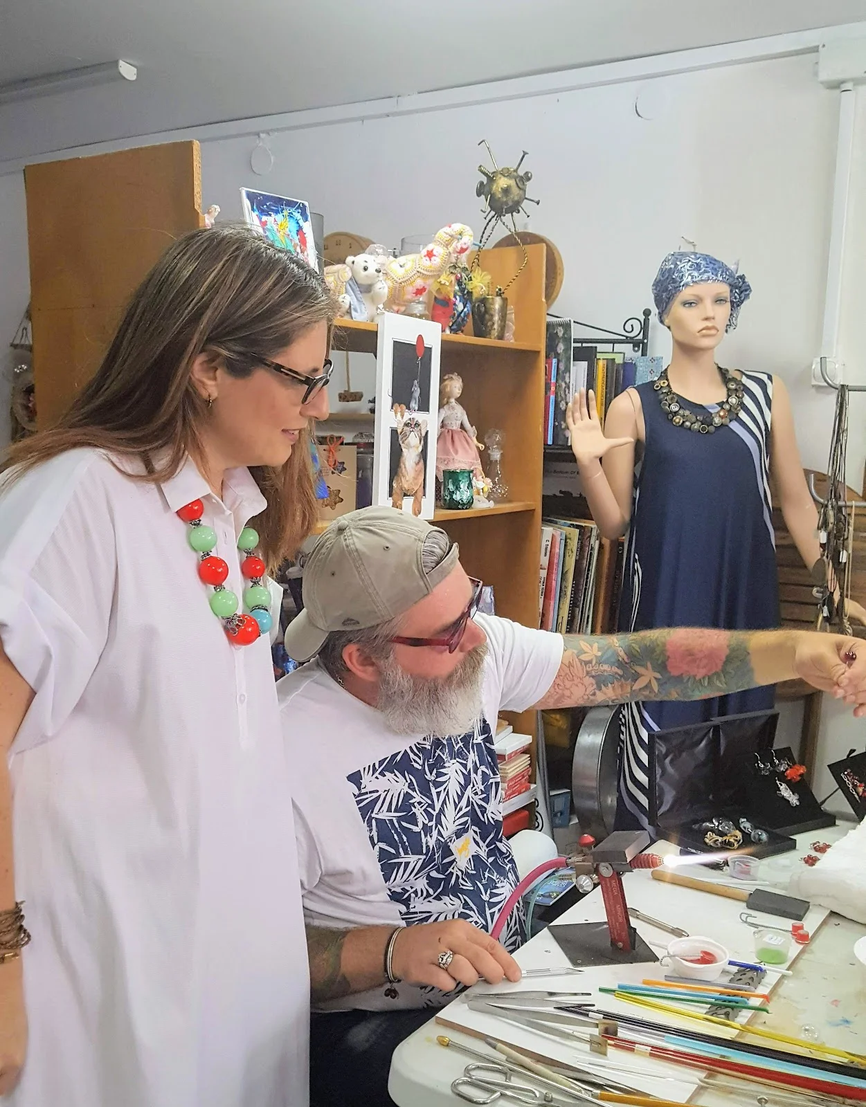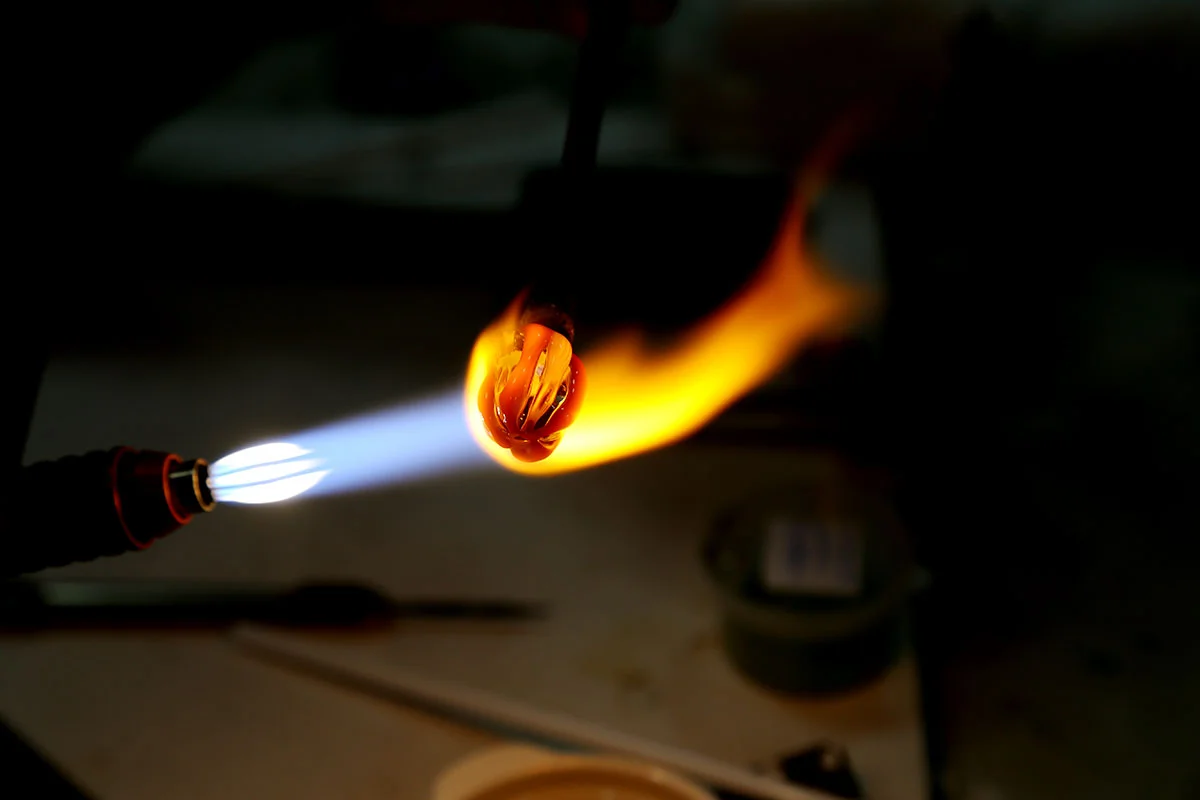 תהליך היצירה של החרוזים הודגם לנו הן של החרוז הגדול – ניפוח זכוכית ויצירת חרוז חלול והן של החרוזים הקטנים שבכל אחד מהם יש גרגר רימון שהזכוכית עוטפת אותו.