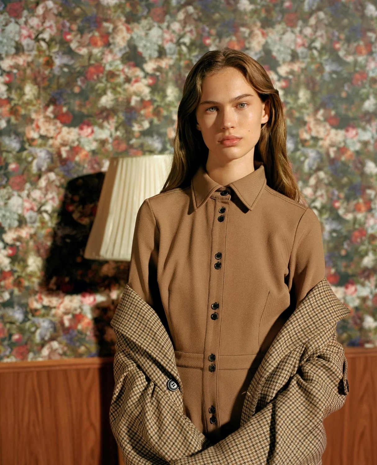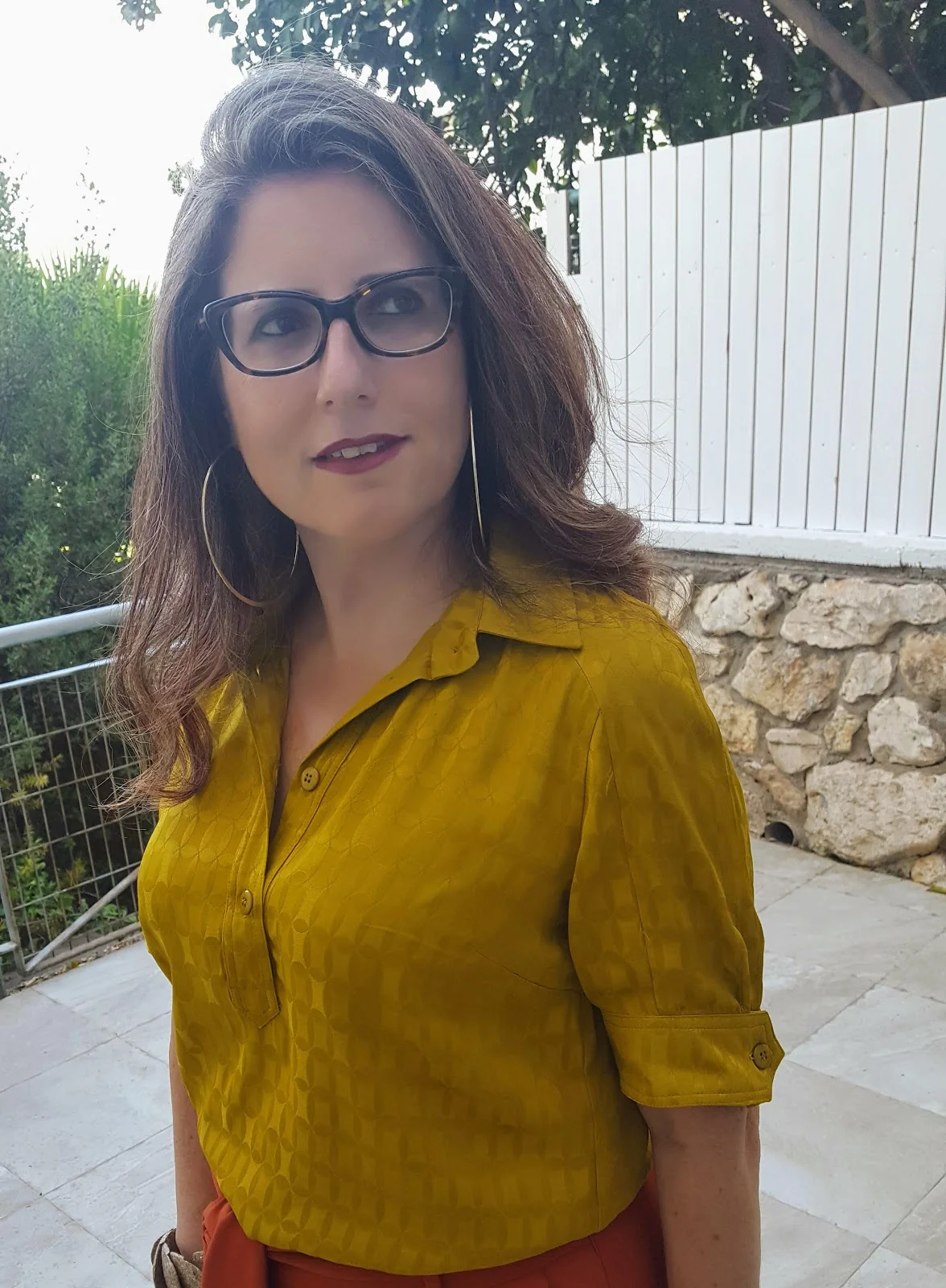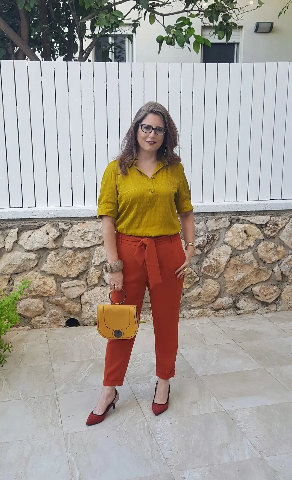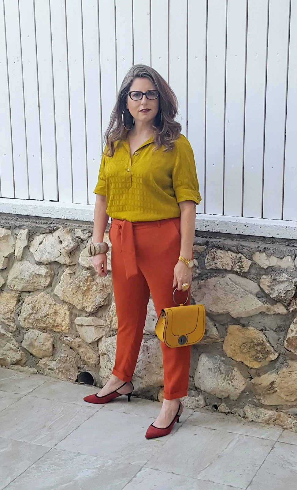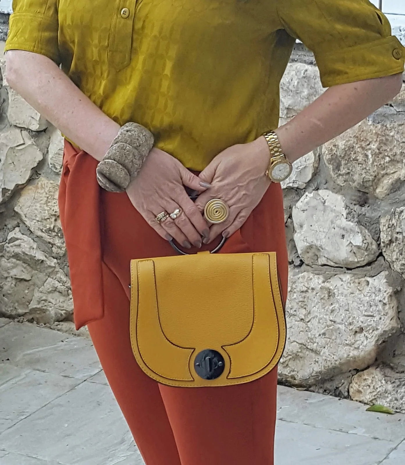 מכנסיים בצבע חום חמרה וחולצה חרדלית עם טקסטורה יפה בבד ושרוולים מעניינים.
