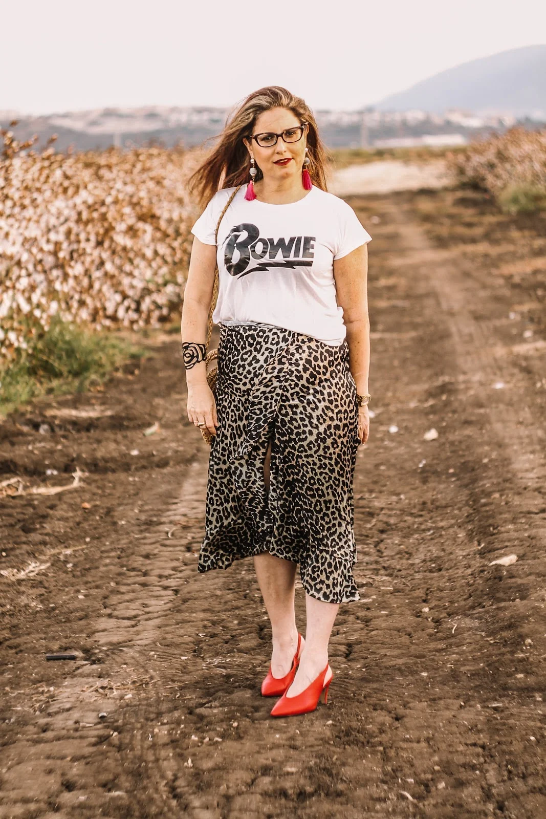 קלאסי קז'ואל – החלפתי את הגופיה השחורה והאלגנטית לטי שרט -הפתרון הפשוט להפוך כל לוק לקז'ואל והוספתי את הצבע האדום בנעליים והעגילים והתיק קש, סניקרס היו הופכות את הלוק לקזו'אל לחלוטין.