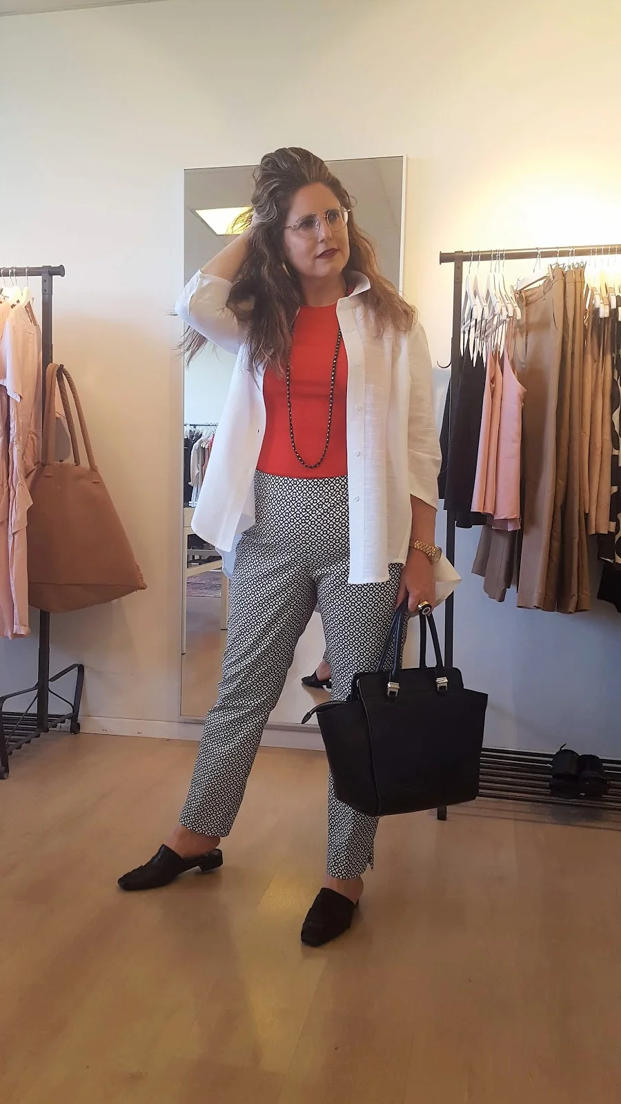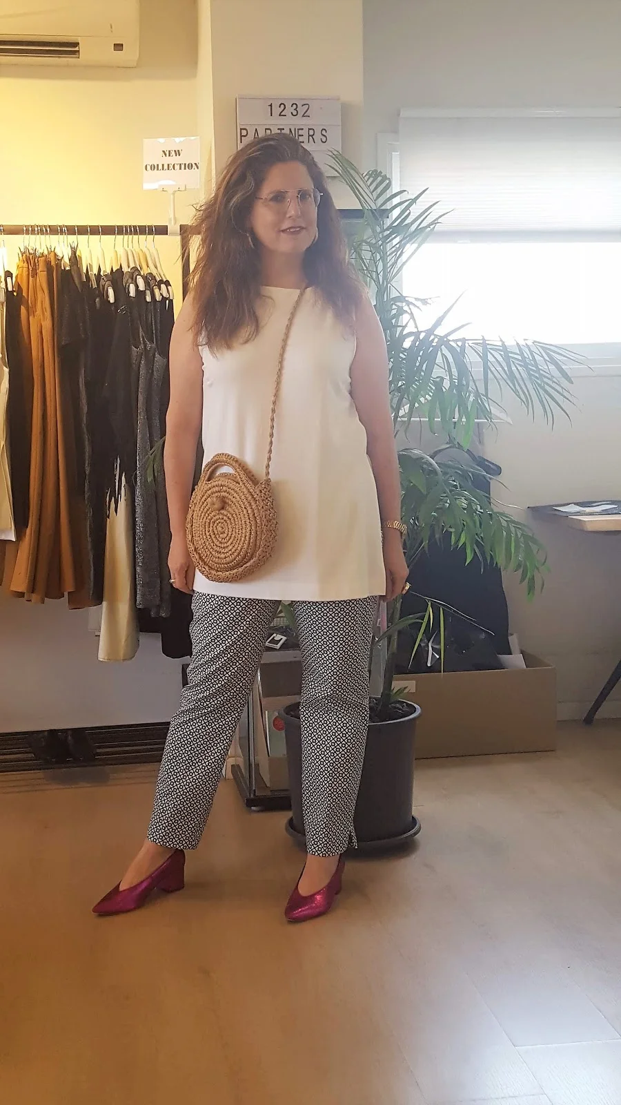 ללוק הראשון בחרתי מכנסיים עם הדפס גאומטרי שחור ושמנת, בגזרת עפרון  מכנסיים שאפשר לעשות להן אין  סוף שילובים.