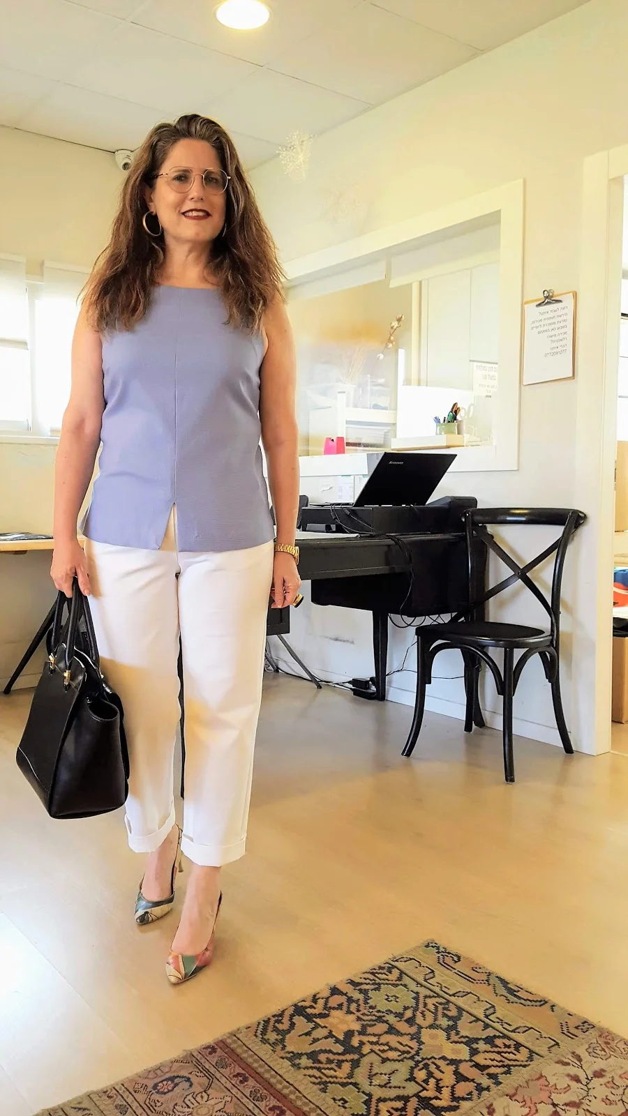 לסיום בחרתי במכנסיים לבנות , גזרה מעולה , אוספת הכל כמו שצריך ,גזרה ישרה מעט מתרחבת וצרפתי חולצה בתכלת – צבע שאני מאוד אוהבת וגם הגזרה ממש אליפות – אני אקנה אתה זה בטוח ,