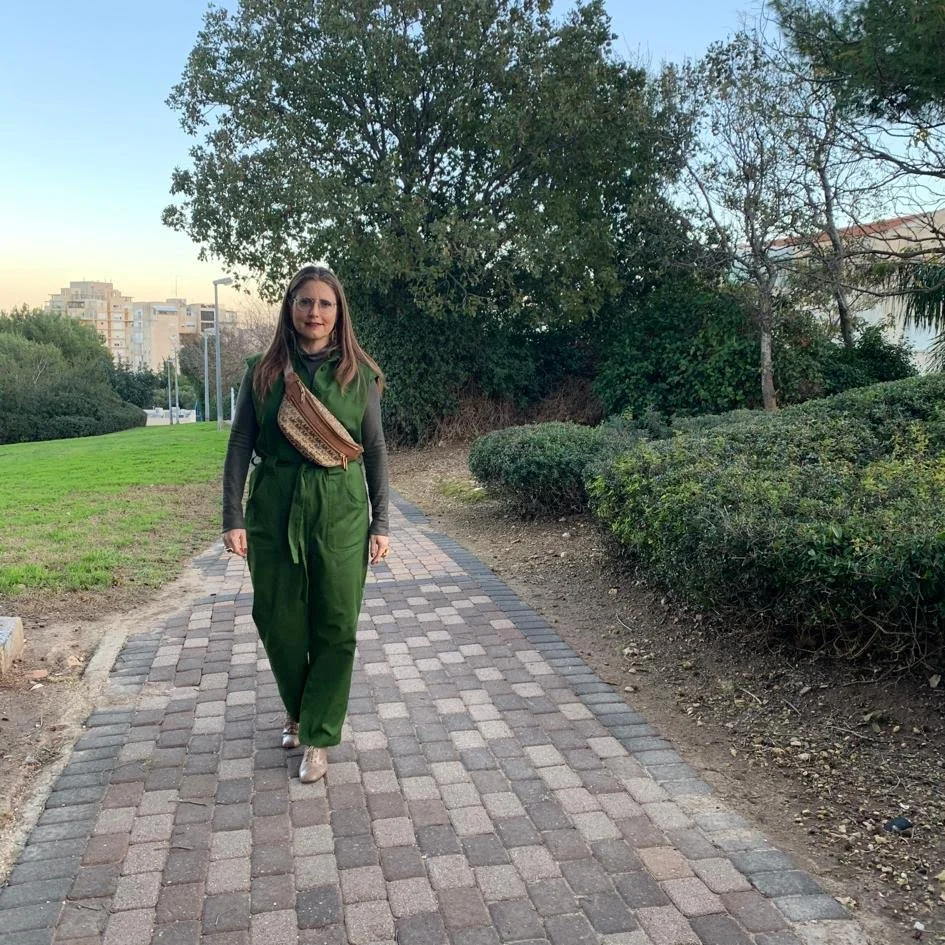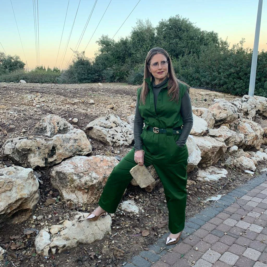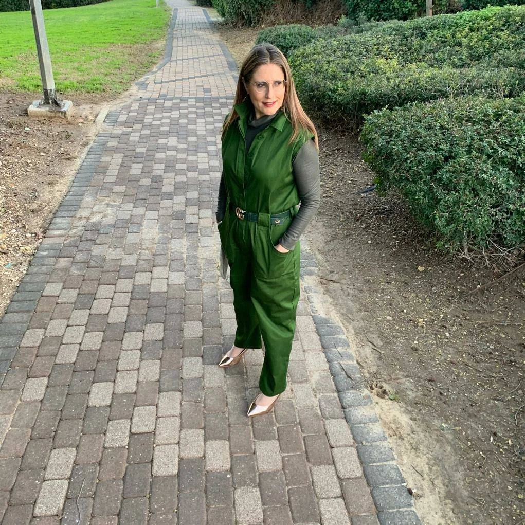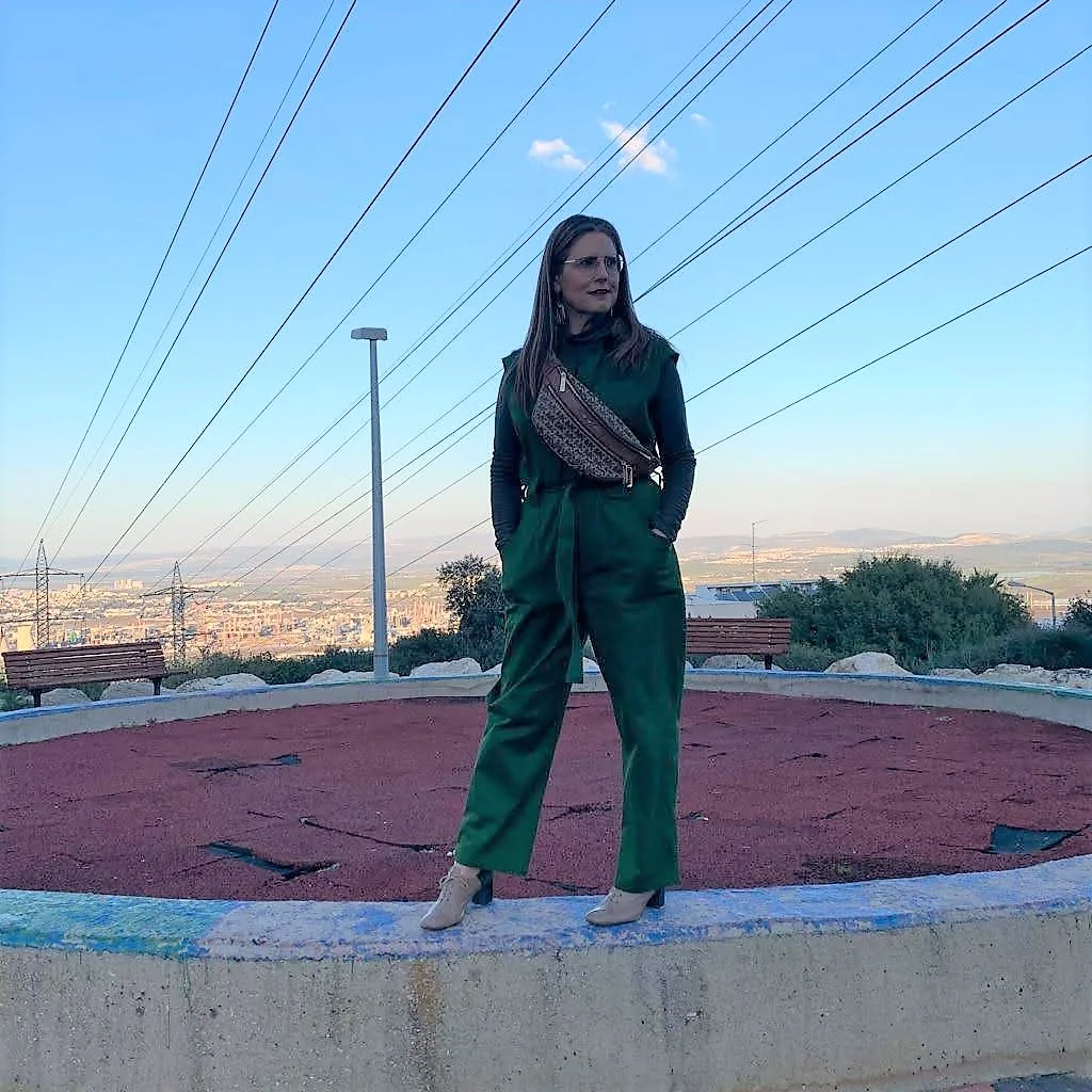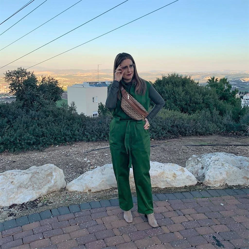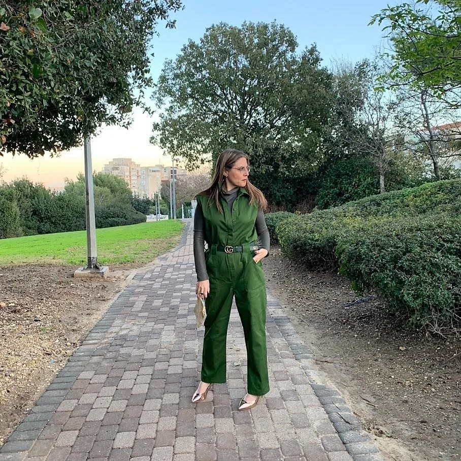 הלוק השני כולל את האוברול ההיסטרי והמחמיא בצבע ירוק משגע עם הגולף הירקרק.