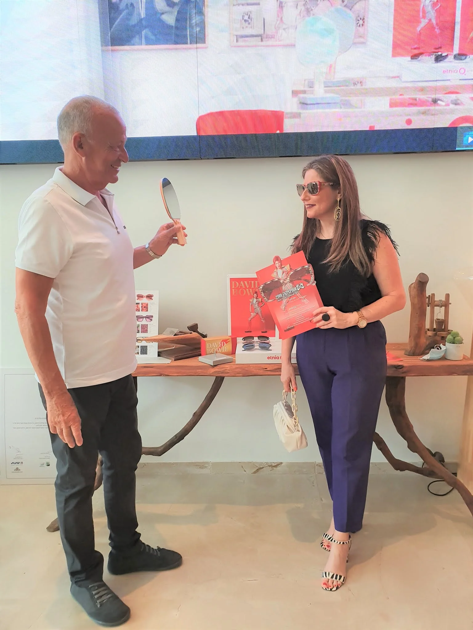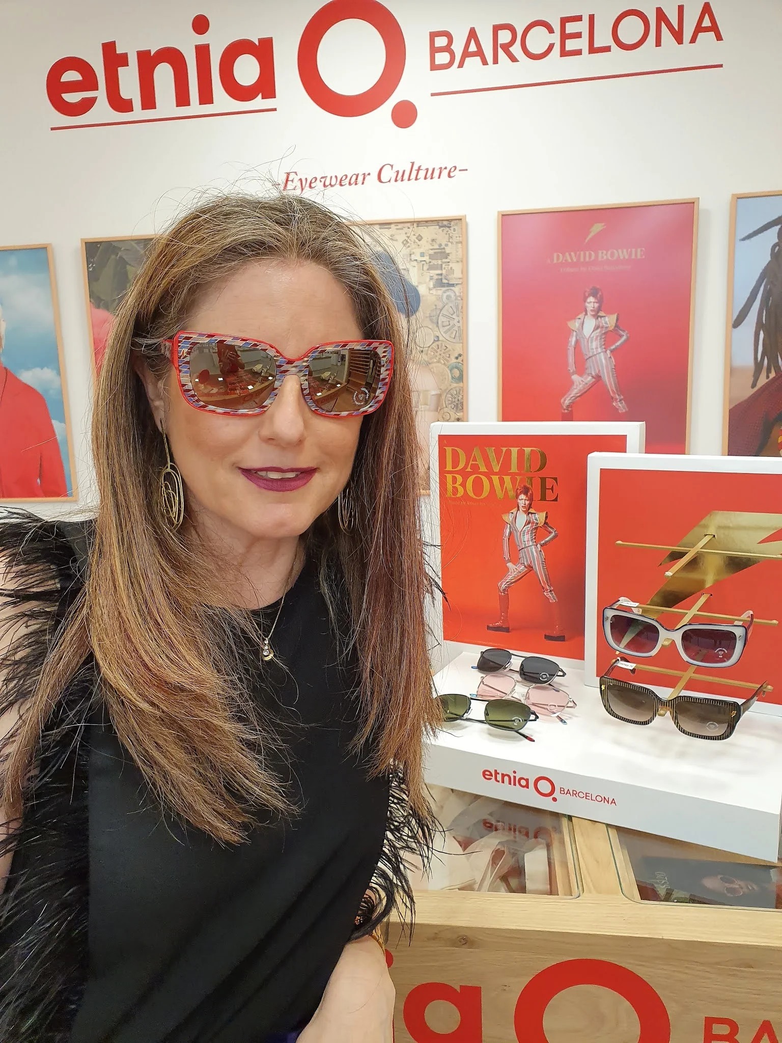 היא הקדישה משקפיים צבעוניות לזמר דודי בואי שהיה אדם צבעוני במיוחד, מדדתי אותן ,תראו כמה שהן מיוחדות ויפות.
