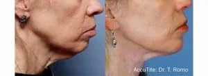 AccuTite – טיפול זעיר פולשני יחיד וראשון מסוגו בארץ! זוהי ידית המיצוק הקטנה ביותר בתחום הרפואה האסתטית המאפשרת לרופא להשתמש בטכנולוגיה בדיוק מרבי באופן נוח ויעיל. לטיפול באזורים בהם העור רפוי ובעלי שומן עודף – כגון שקיות מתחת לעיניים. תהליך המתבצע בהרדמה מקומית או אלחוש קל. בתום ההליך המטופל משחורר הביתה וניתן לחזור לשגרה תוך זמן קצר. אזורי טיפול: גבות, אזור העיניים, שליש תחתון של הפנים וצוואר. תוצאה נראית לעין מיידית כשהתוצאה משתפרת עם הזמן ומגיעה לשיאה לאחר כחצי שנה ממועד הטיפול.