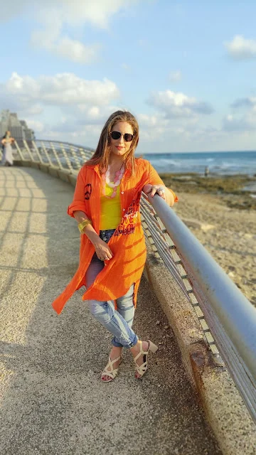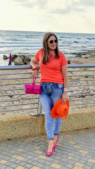 לוק ראשון : ג'ינס מחטב ,גזרה מעולה עם טישרט מדליקה בכתום, שלבתי עם אקססוריז ורודים.
