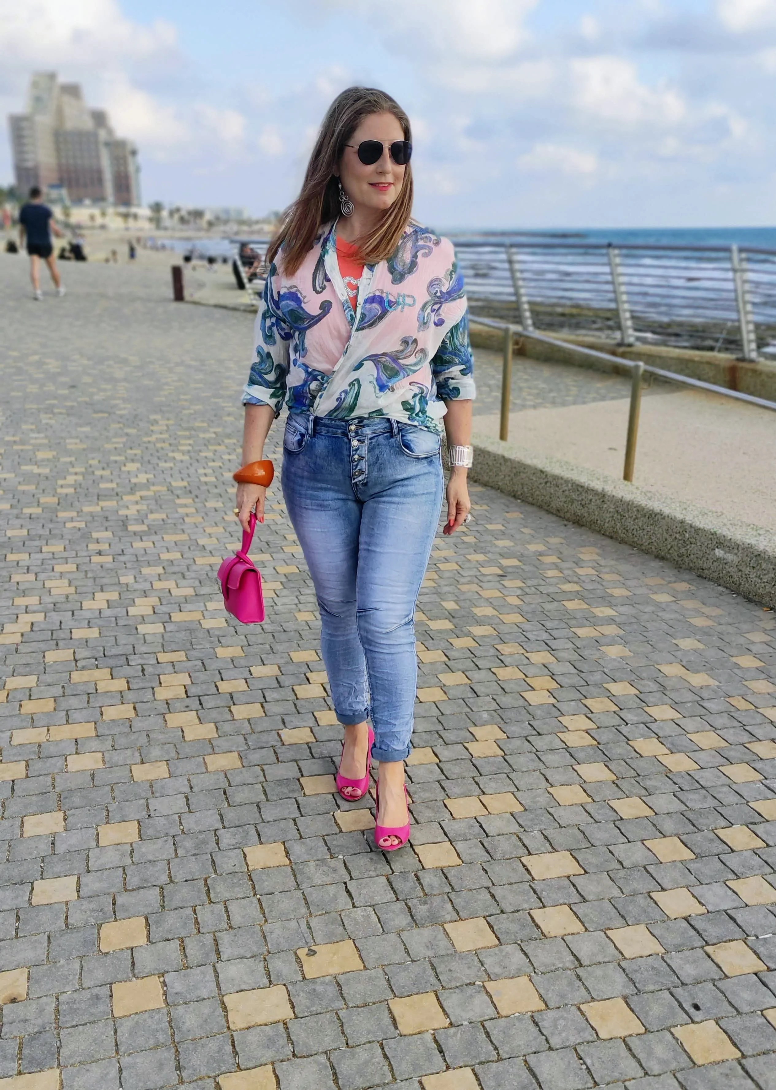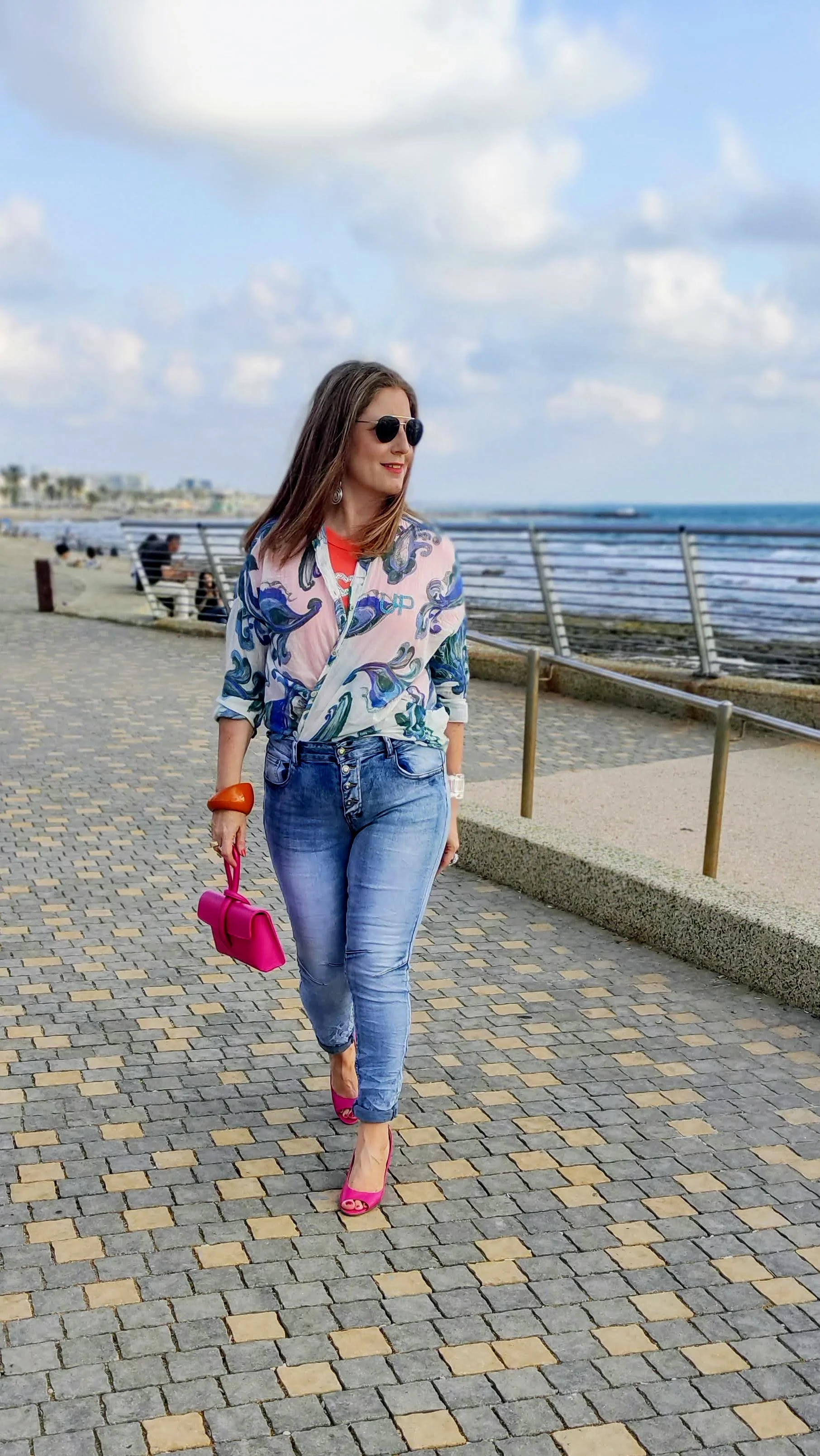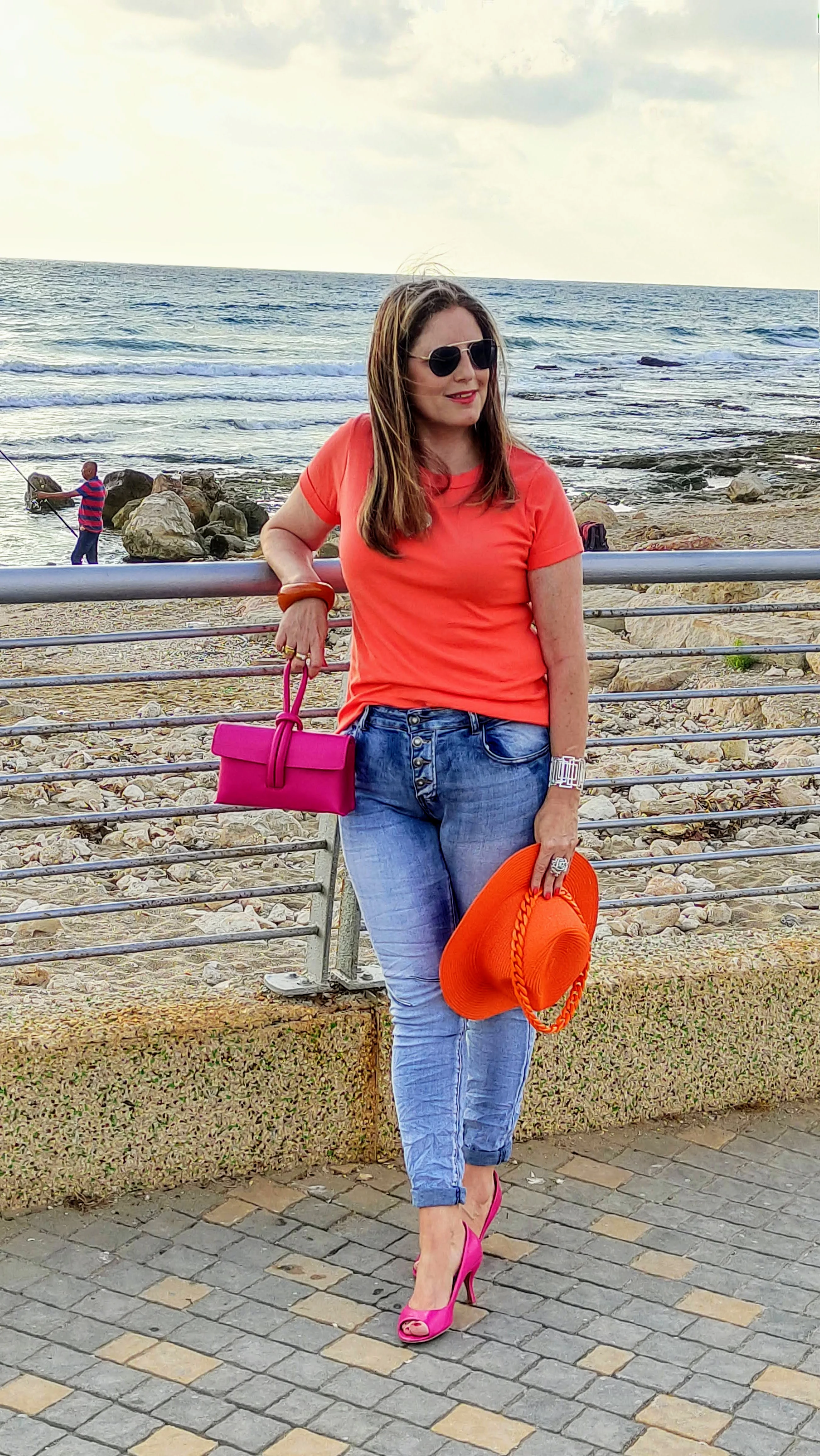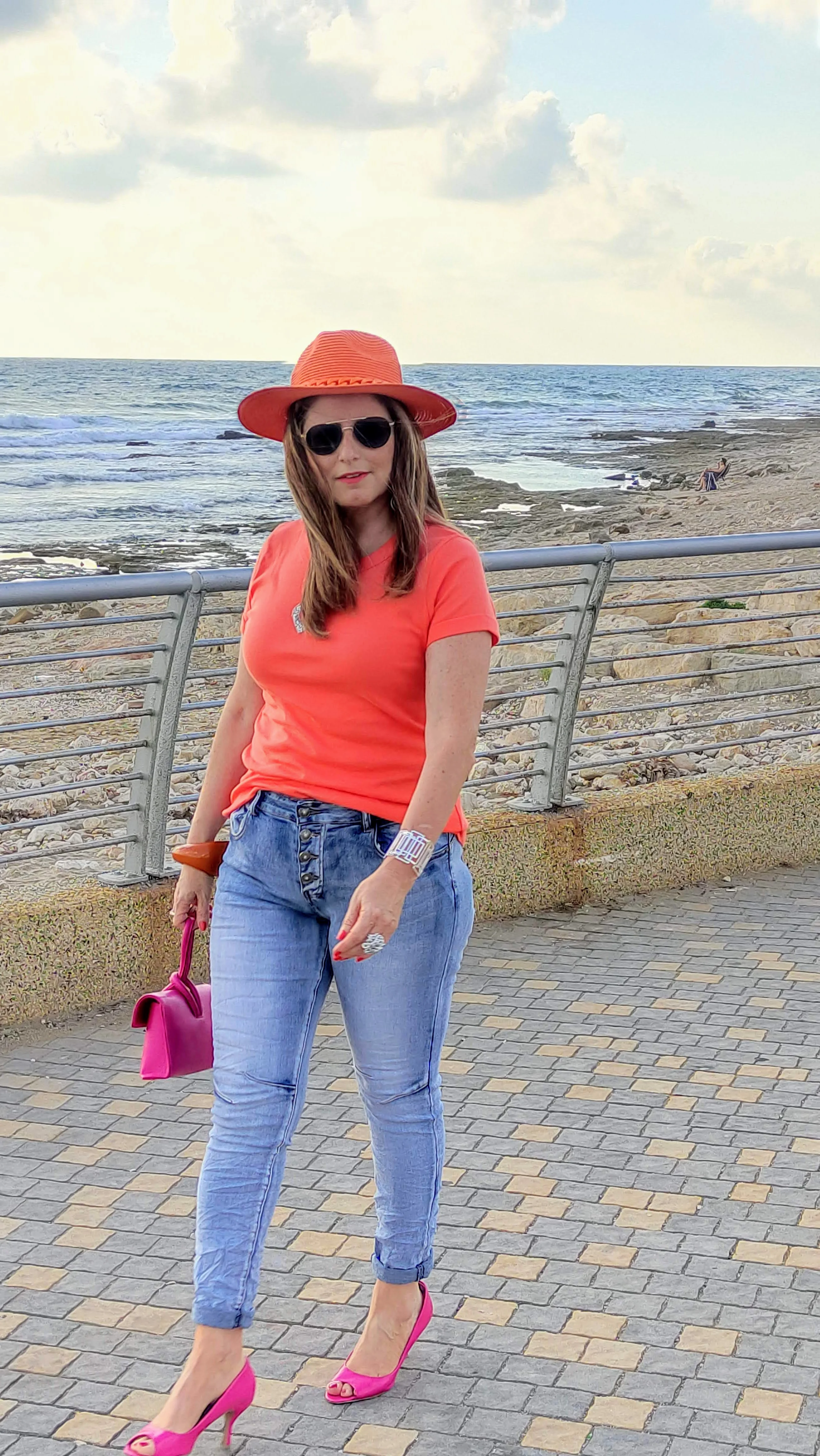 לוק ראשון : ג'ינס מחטב ,גזרה מעולה עם טישרט מדליקה בכתום, שלבתי עם אקססוריז ורודים.